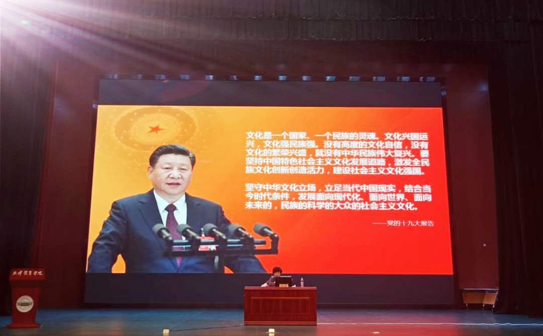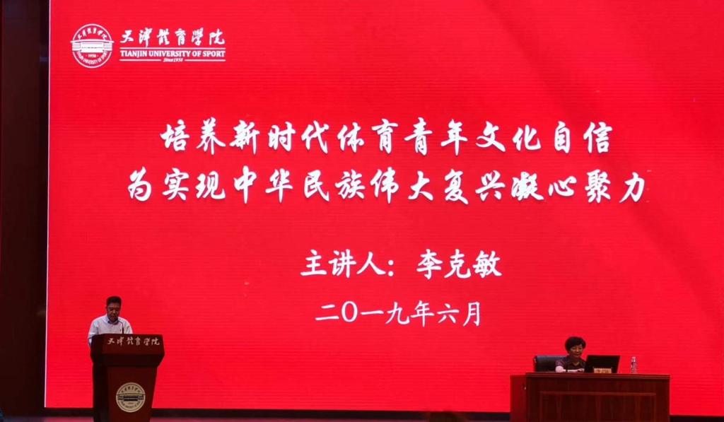 习近平总书记主持召开学校思想政治理论课教师座谈会并发表重要讲话,要求各地区各部门负责同志要积极到学校去讲思政课。为贯彻落实习近平总书记重要讲话精神。按照天津市委教育领导工作小组下发的津党教〔2019〕4号《关于领导干部进校园开展思想政治工作的通知》要求,6月13日下午,天津市体育局党委书记、局长李克敏以“培养新时代体育青年文化自信,为实现中华民族伟大复兴凝心聚力”为主题的思政课在天津体育学院进行。体职院党委副书记、院长刘钦龙、教师和学生代表共计160余人聆听本次思政课。