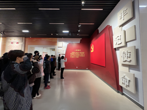 “我志愿加入中国共产党,拥护党的纲领,遵守党的章程……”参观尾声,在党委书记带领下,全体党员面对鲜红的党旗,郑重举起右拳,庄严宣誓,铿锵誓言掷地有声。通过重温入党誓词,使党员同志牢记初心使命,坚定理想信念,始终保持党员的先进性,保持共产党员的本色,进一步强化党员意识,不断坚定共产主义理想信念。