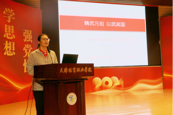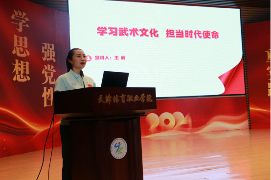 报告分享阶段,体职院2021级学生牛宗帅、体武射高级教练员王菊和霍元甲第五代传人、天津体育学院教授霍静虹分别以《以热爱 点燃梦想》《学习武术文化 担当时代使命》和《精武元祖 以武报国》为题作报告,他们从学生、教练员、专家的不同身份,以感人肺腑的学习实习、工作实践经历,从不同角度分享了对中华传统文化——武术的热爱和传承,带领大家领略武术的博大精深,感受武术文化的独特魅力,讲述了天津体育故事,引导学生充分感受天津的文化特色和精神气质,激发热爱天津、建设天津、扎根天津的热情,自觉做体育发展的推动者、天津文化的传承者,在体育故事中享受乐趣、健全人格、锤炼意志。