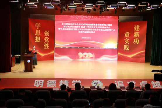 6月7日下午,讲好天津体育故事 推进中华传统文化进校园分享会暨best365足球官网与天津市体操武术射击射箭运动管理中心党建共建签约仪式在体职院报告厅举办。天津市体操武术射击射箭运动管理中心党总支书记、主任黄吉、副主任冯兆坤、霍元甲第五代传人、天津体育学院教授霍静虹、体武射组织宣传部部长、高级教练员、全国冠军王菊和学院党委书记杨军、党委委员、副院长刘宇出席活动,学院党员代表、学生代表参加活动。