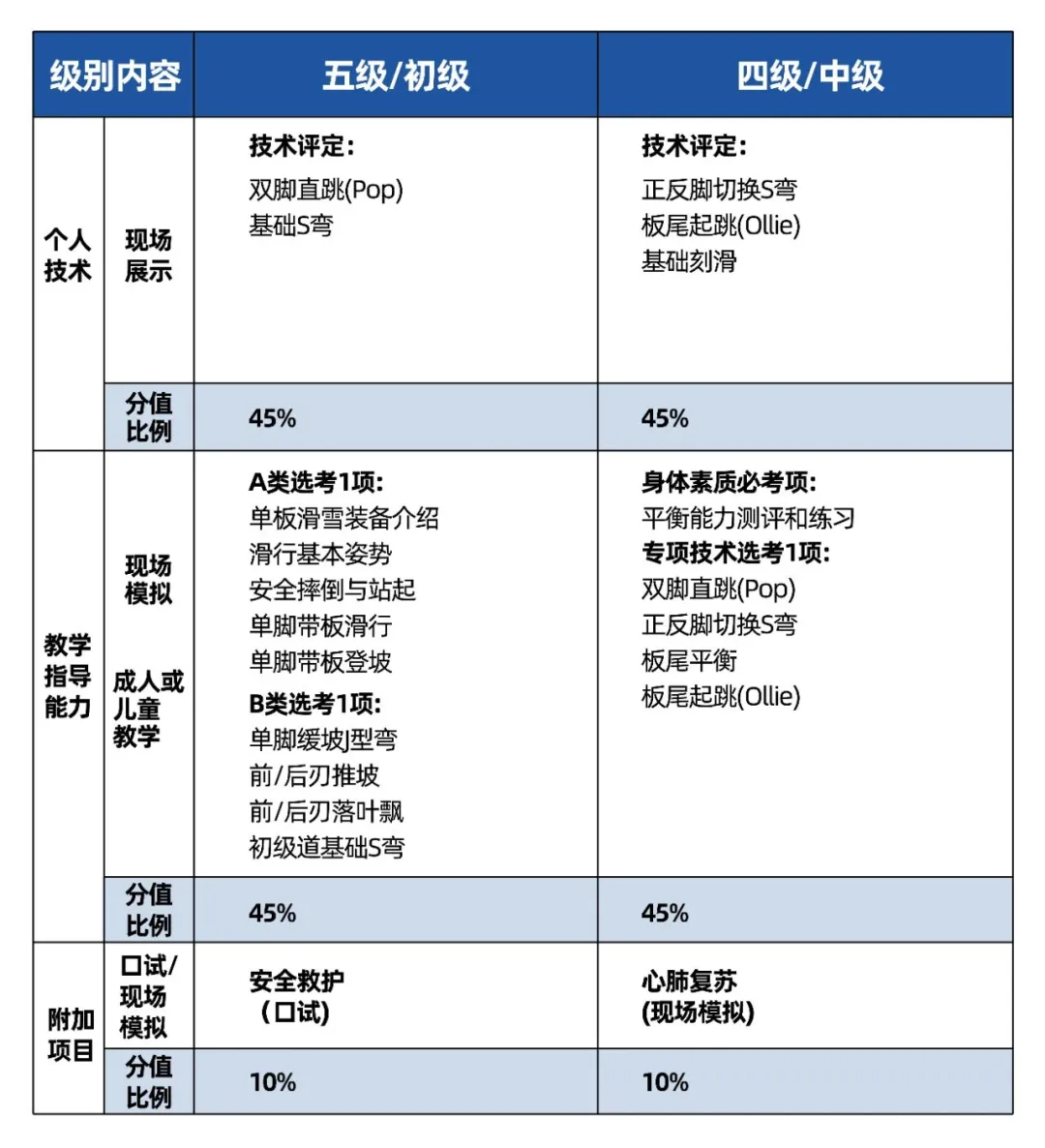 培训内容、方式和鉴定依据《国家职业标准》规定进行,内容分为理论知识、专项技能两部分。鉴定的理论知识考试采用闭卷笔试方式,试题从国家体育总局试题库提取,技能操作考试由专项技术培训考核和专项指导能力考核两部分组成,由具备资质的考评员综合打分评定。理论知识考试与技能操作考核均采取百分制,成绩皆达60分以上者为合格。