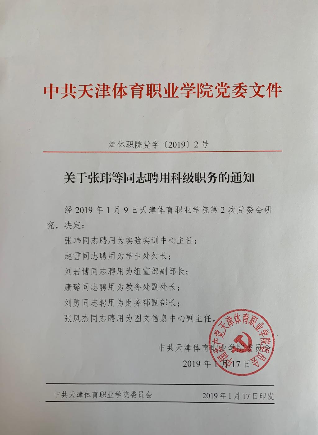关于张玮等同志聘用科级职务的通知